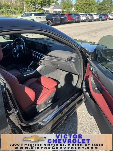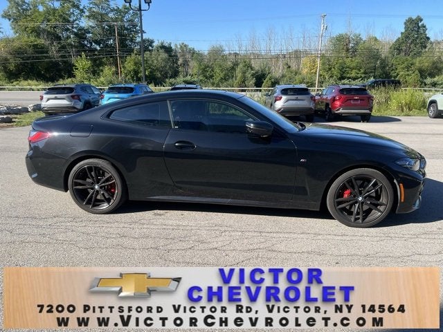 This 4 Series M440i xDrive is nicely equipped with Connected Package Pro, 10 Speakers, 4-Wheel Disc Brakes, ABS brakes, Air Conditioning, Alloy wheels, AM/FM Radio, AM/FM radio: SiriusXM with 360L, Apple CarPlay & Android Auto Compatibility, Auto High-beam Headlights, Auto-dimming door mirrors, Auto-dimming Rear-View mirror, Automatic temperature control, BMW Assist eCall, BMW TeleServices, Brake assist, Bumpers: body-color, Compass, ConnectedDrive Services, Delay-off headlights, Driver door bin, Driver vanity mirror, Dual front impact airbags, Dual front side impact airbags, Electronic Stability Control, Emergency communication system: BMW Assist eCall, Exterior Parking Camera Rear, Four wheel independent suspension, Front anti-roll bar, Front Bucket Seats, Front Center Armrest, Front dual zone A/C, Front reading lights, Fully automatic headlights, Garage door transmitter, Heated door mirrors, Hi-Fi Sound System, Illuminated entry, Knee airbag, Leather steering wheel, Low tire pressure warning, Lumbar Support, Memory seat, Navigation, Navigation System, Occupant sensing airbag, Outside temperature display, Overhead airbag, Overhead console, Panic alarm, Passenger door bin, Passenger vanity mirror, Perforated SensaTec Upholstery, Power door mirrors, Power driver seat, Power Front Seats, Power moonroof, Power passenger seat, Power steering, Power windows, Radio data system, Rain sensing wipers, Rear anti-roll bar, Rear reading lights, Rear seat center armrest, Rear window defroster, Remote keyless entry, Security system, SiriusXM w/360L, Speed control, Speed-sensing steering, Speed-Sensitive Wipers, Split folding rear seat, Spoiler, Sport Seats, Sport steering wheel, Steering wheel mounted audio controls, Tachometer, Telescoping steering wheel, Tilt steering wheel, Traction control, Trip computer, Turn signal indicator mirrors, Variably intermittent wipers, Wheels: 18 x 7.5 (Style 848M), Widescreen Display, and Wireless Device Charging.