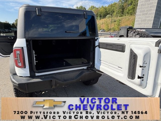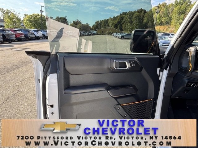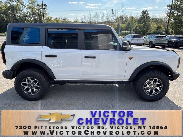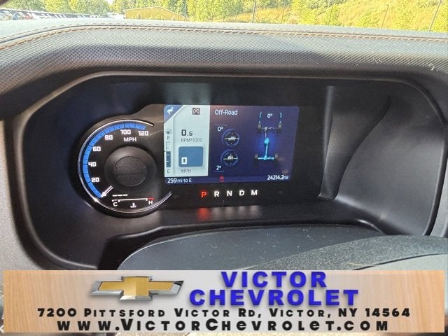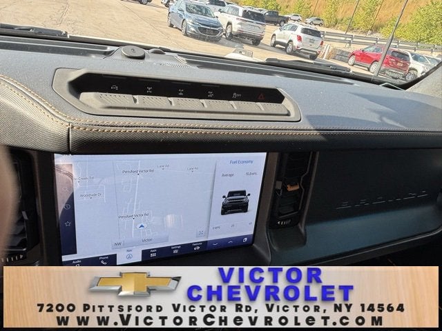 2024 Ford Bronco Badlands 4WDThis Bronco Badlands is nicely equipped with Equipment Group 334A High/Lux Package (10 Speakers w/Subwoofer, 2-Door Intelligent Access w/Lock/Unlock, 360-Degree Camera, Adaptive Cruise Control, Additional Sound Deadening, Ambient Footwell Lighting, Auto-Dimming Interior Rear-View Mirror, Dr & Pass Illuminated Sliding Visor Vanity Mirrors, Dual Smart Charging USB Ports, Dual-Zone Electronic Automatic Temperature Control, Evasive Steering Assist, Front Parking Sensors, Front Row Heated Seats, Heated Steering Wheel, Information on Demand Panel, Power Outlet - Back Side of Center Floor Console, Radio: B&O Sound System by Bang & Olufsen, Rear Parking Sensors, Sideview Mirrors, Universal Garage Door Opener, and Wireless Charging Pad), 4-Wheel Disc Brakes, 4.7 Axle Ratio, 7 Speakers, ABS brakes, Air Conditioning, Alloy wheels, AM/FM radio: SiriusXM with 360L, AM/FM Stereo, Auto High-Beam Headlamps, Auto High-beam Headlights, BLIS Blind Spot Information System, Brake assist, Carbonized Gray Molded-In-Color Hard Top, Compass, Delay-off headlights, Driver door bin, Driver vanity mirror, Dual front impact airbags, Dual front side impact airbags, Electronic Stability Control, Emergency communication system: 911 Assist, Engine Block Heater, Exterior Parking Camera Rear, Front & Rear Floor Liners, Front anti-roll bar, Front Bucket Seats, Front Center Armrest, Front License Plate Bracket, Front reading lights, Front Row Top Panels Storage Bag, Front wheel independent suspension, Fully automatic headlights, Hard Top Sound Deadening Headliner, Heated door mirrors, Illuminated entry, Integrated roll-over protection, Lane-Keeping System, Leather Shift Knob, Low tire pressure warning, Marine Grade Vinyl Bucket Seats, Occupant sensing airbag, Outside temperature display, Overhead airbag, Overhead console, Panic alarm, Passenger door bin, Passenger vanity mirror, Power door mirrors, Power steering, Power windows, Pre-Collision Assist w/Automatic Emergency Braking, Radio data system, Rear-View Camera, Rear-Window Defroster & Washer, Remote keyless entry, Security system, SiriusXM Radio w/360L, Speed control, Split folding rear seat, Steering wheel mounted audio controls, SYNC 4, Tachometer, Telescoping steering wheel, Tilt steering wheel, Traction control, Trip computer, Variably intermittent wipers, Voltmeter, and Wheels: 17 Machined Carbonized Aluminum.Victor Chevrolet is more than your VICTOR source of Chevrolet cars, trucks and SUVS; we also have a deep commitment to support community and youth organizations in the Rochester area. Learn more about how Victor Chevrolet gives back to the city and people of VICTOR NY.